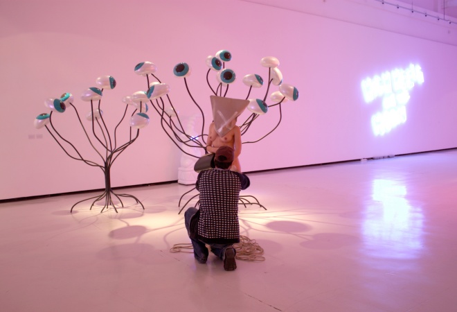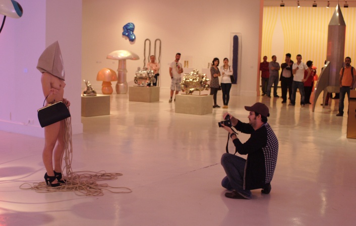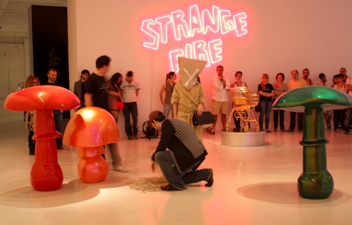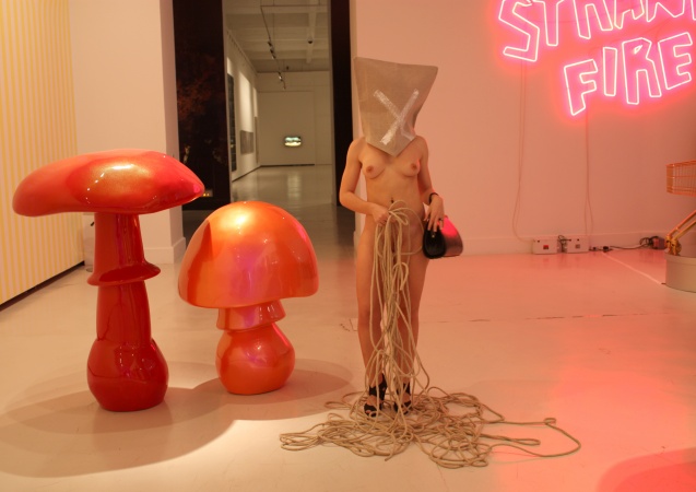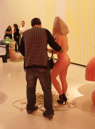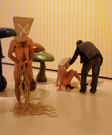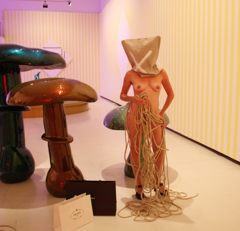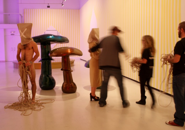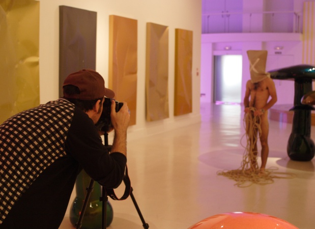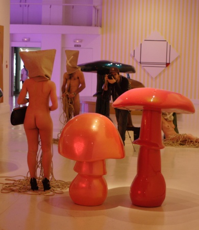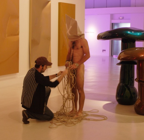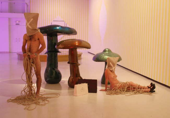 VIII En esta ocasión contará con la participación de tres modelos, dos femeninos y uno masculino, que posaron con la estética que caracteriza sus creaciones: desnudos, rodeados de cuerdas y con el rostro cubierto por un saco de tela. Tres seres humanos que no interactúan entre ellos, personajes simbólicos en fase de evolución que nos representan individualmente a todos y a ninguno de nosotros en concreto. Una composición sencilla, para reflejar soledad y aislamiento, con las obras de Sylvie Fleury como telón de fondo. Sobre la obra de la artista suiza ha declarado: “Me interesan mucho las setas de colores de Fleury como contexto donde situar a mis personajes, ya que me dan pie a plantear nuevas lecturas. En mi obra siempre propongo un cambio, una metamorfosis, pero mezclar mi filosofía con un contexto con tintes psicodélicos y dentro de un centro de arte, hace que el despertar sea más que nunca un juego entre lo real y lo irreal. Expongo un mensaje de ambigüedad y planteo una pregunta: lo que hago yo y otros tantos artistas como Sylvie Fleury, que critican el materialismo y la superficialidad de la sociedad, es verdaderamente una crítica o una pieza más del engranaje del sistema”. Texto: Susana Hermoso-Espinosa García |