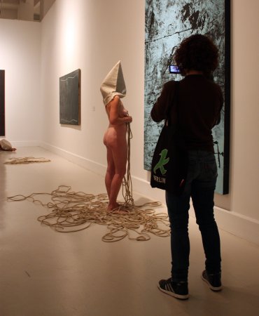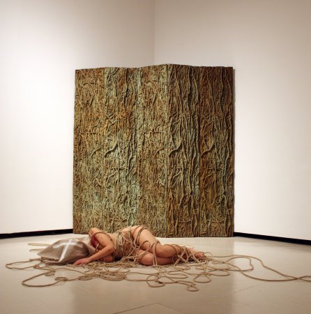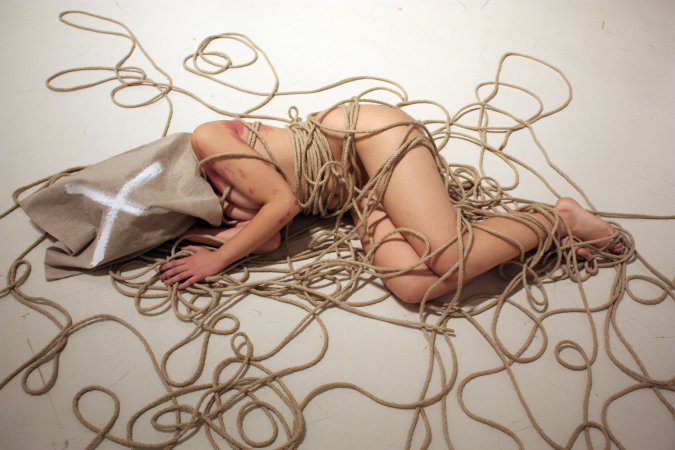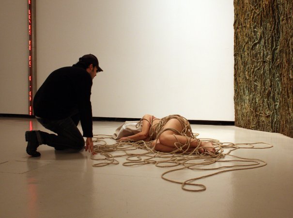 que caracteriza sus creaciones: desnudos, rodeados de cuerdas y con el