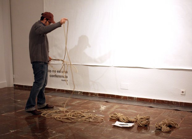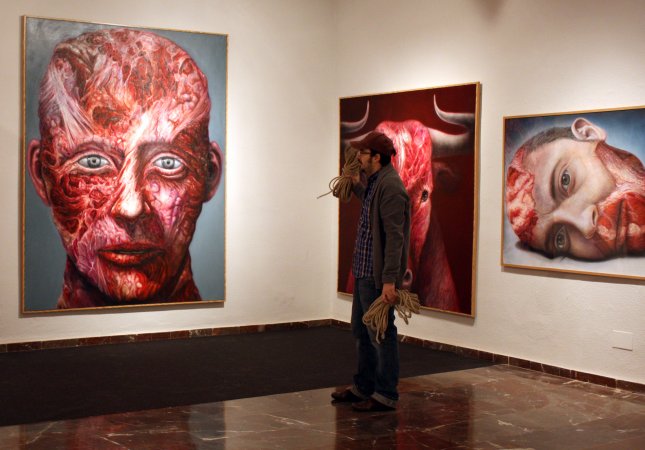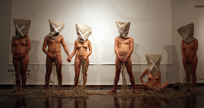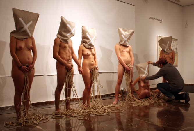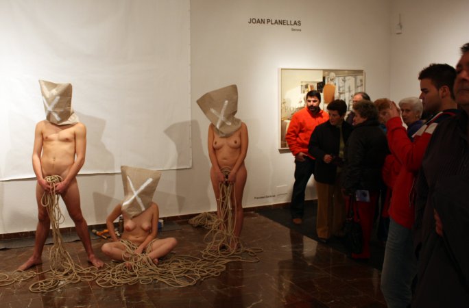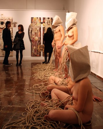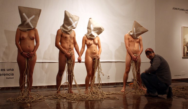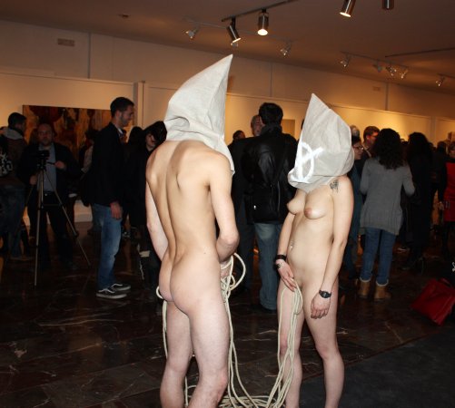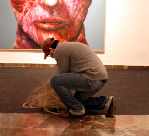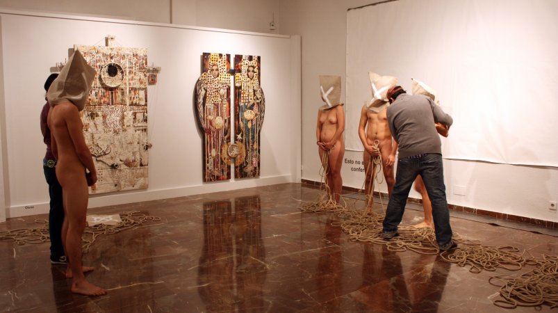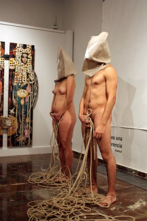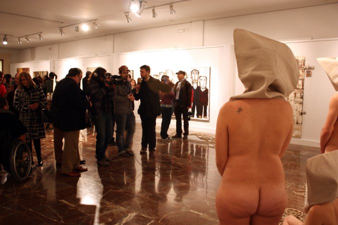 Metamorfosis XIII La acción tuvo lugar durante la inauguración oficial de la Feria. Para la pieza, contó con un nutrido grupo de modelos que interactuaron con las salas del Museo, integrándose con las obras ahí expuestas y sorprendiendo al numeroso público que acudió a la inauguración. Durante la performance el artista realizó dos composiciones. Dispuso un primer grupo de seis metas al fondo de la sala expositiva, posando frontalmente delante de una pared desnuda cubierta por un lienzo en blanco, creando una imagen que recordaba a aquellos retratos de las familias reales pintados por los pintores de la corte. La rotundidad de la pieza se remarcó iluminándola como si de un grupo escultórico se tratara. En el otro extremo de la sala, situó una pareja frente a frente, rodeados de obras del artista Miguel Scheroff. Rostros desollados envolviendo a una mujer y a un hombre en estado de Metamorfosis, haciendo aún más turbadora la imagen. Texto: Susana Hermoso-Espinosa García |