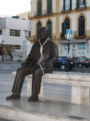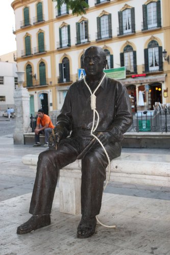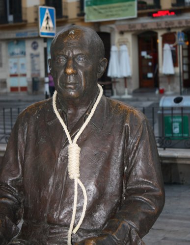Pablo Picasso Representa a un Picasso decepcionado con la evolución cultural de este país, y en general por el maltrato que recibe la cultura en España, hasta el punto que decide atarse una soga al cuello y quitarse la vida. Es una forma simbólica de representar la desesperación y la impotencia que viven los creadores comprometidos con el arte en la actualidad. Hoy en día los artistas se mueven